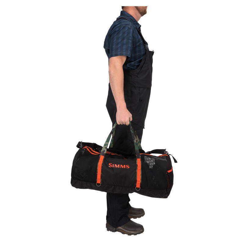 Simms Challenger Mesh Duffel 60L to torba zaprojektowana do transportu i przechowywania wodery, butów brodzeniowych oraz akcesoriów wędkarskich. Pojemna komora główna z dużym, zapinanym na zamek otworem umożliwia łatwy dostęp do zawartości i wygodne pakowanie większych elementów ekwipunku. Dzięki zastosowaniu przewiewnej tkaniny mesh, wnętrze torby jest dobrze wentylowane, co pomaga w odprowadzaniu wilgoci z mokrych ubrań i obuwia.