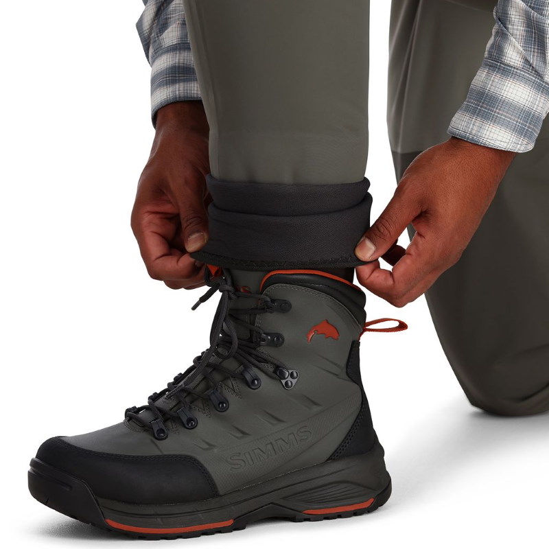 Model wyposażono w elastyczne szelki z autorskimi klamrami Simms, które umożliwiają łatwą konwersję do wysokości pasa. Przednia kieszeń na piersi oferuje dostęp do elastycznej kieszeni na drobiazgi, kieszenie ogrzewające dłonie z mikropolaru oraz zintegrowany uchwyt na muchy. Patentowane szwy na nogawkach poprawiają dopasowanie i zwiększają mobilność, co jest istotne podczas przemieszczania się po brzegu lub brodzenia w rzece.