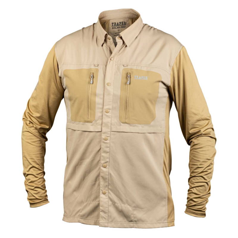 Koszule z serii Solar Pro cechują najwyższej jakości materiały oraz perfekcja wykonania. Koszule składają się z dwóch różnych tkanin. Na rękawach i bokach koszuli zastosowano bardzo miękki i rozciągliwy poliester ze spandexem. Ma on za zadanie odprowadzanie potu jednocześnie dokładnie dopasowując się do sylwetki. Korpus koszuli uszyty jest z poliestru klasy UPF 50. Jest to bardzo skuteczna bariera przeciwsłoneczna. Kołnierzyk przypinany jest na zatrzaski. Umożliwia to szybkie podniesienie aby chronić szyję w razie silnego nasłonecznienia. Na piersiach znajdują się dwie bezszwowe, elastyczne kieszenie zamykane na suwaki. Dzięki nim mamy pod ręką pudełka z przynętami. Przy kieszeniach znajdują się dwie pętelki do zaczepiania akcesoriów.