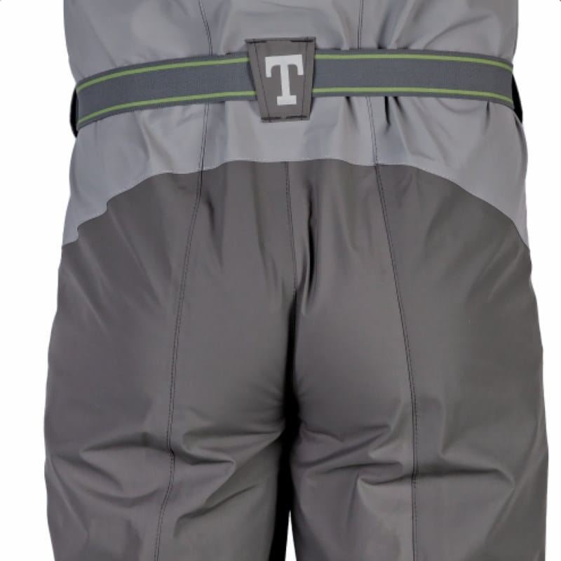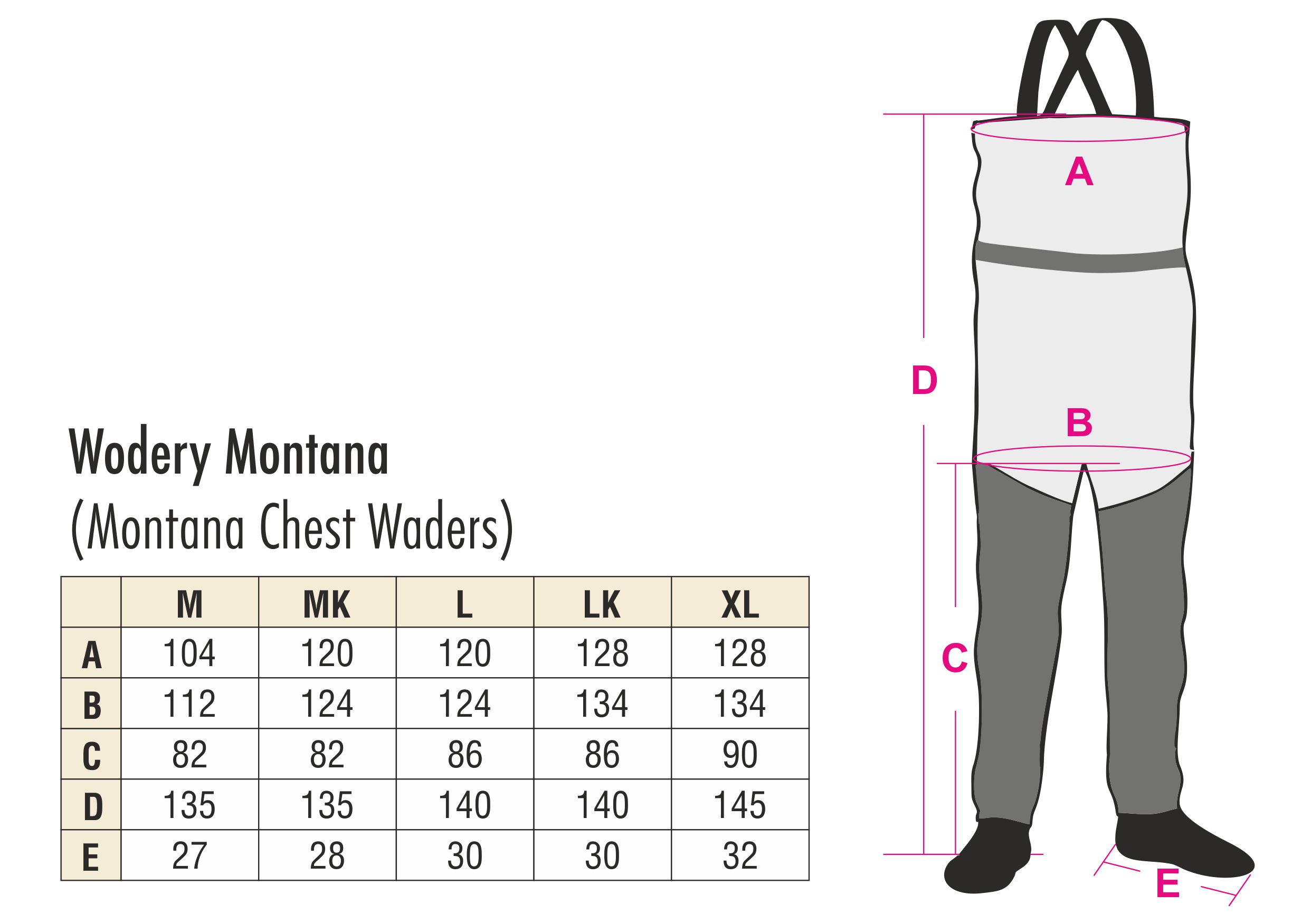 Wodery wykonane są z czterowarstwowego, japońskiego materiału firmy TORAY. Wodery posiadają wyjątkowy krój ułatwiający chodzenie, kucanie oraz zakładanie i zdejmowanie. Linia szycia przebiega z przodu i z tyłu nogawek. Zabezpiecza to wewnętrzne części nogawek na wysokości kolan przed przetarciem. Nogawki są specjalnie wyprofilowane, dzięki temu nasze ruchy są nieskrępowane. W górnej części woderów umieszczono obszerną zewnętrzną kieszeń na akcesoria. Dwie boczne kieszenie służą są do ogrzewania rąk. Wewnętrzna kieszeń z wieloma przegródkami jest wypinana, którą można wymienić na kieszeń wodoodporną z naszej oferty, kupowaną oddzielnie. Dodatkowym elementem są: patka na przynęty, zaczepy do przyrządów oraz umieszczony z tyłu zaczep do podbieraka. W woderach Montana zastosowano system rolowania. Wygodne regulowane szelki są wykończone miękkim i elastycznym neoprenem. Skarpety wykonano z 5 milimetrowego neoprenu firmy 3M. Na spodzie znajduje się bieżnik antypoślizgowy. Osłona przeciwżwirowa wykańcza dolną cześć woderów. Kieszenie woderów zamykane są na bryzgoszczelne zamki YKK.
