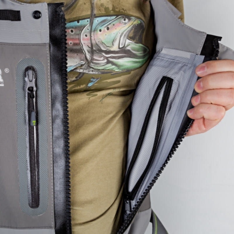 Do wyprodukowania woderów Montana T-Zip użyto japońskiego, czterowarstwowego materiału firmy TORAY. Charakteryzuje się on dużą oddychalnością, miękkością oraz wysoką wodoodpornością. Wodery posiadają wyjątkowy krój ułatwiający chodzenie, kucanie oraz zakładanie i zdejmowanie. Linia szycia przebiega z przodu i z tyłu nogawek. Zabezpiecza to wewnętrzne części nogawek na wysokości kolan przed przetarciem. Nogawki są specjalnie wyprofilowane, dzięki temu nasze ruchy są nieskrępowane. Główny zamek niemieckiej firmy T-Zip gwarantuje całkowicie wodoodporne zamknięcie. Wodery mają skarpety z neoprenu wysokiej gęstości o grubości 5 mm, firmy 3M z antypoślizgowym protektorem od spodu. Osłona przeciwżwirowa wykańcza dolną część nogawek. Górna część woderów, wyposażona jest w kieszenie na akcesoria, wewnętrzna kieszeń na dokumenty, oraz dwie kieszenie wyścielone fleecem do ogrzewania rąk. Wygodne, regulowane szelki z neoprenu wyposażone są z przodu w zaczepy na osprzęt, natomiast z tyłu znajduje się zaczep do podbieraka. Wszystkie kieszenie zaopatrzone w bryzgoszczelne zamki firmy YK.